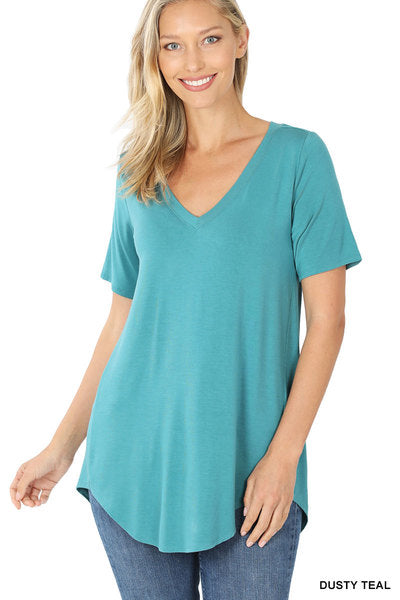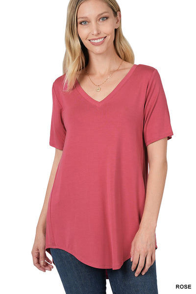 LUXE RAYON SHORT SLEEVE V-NECK HI-LOW HEM TOP