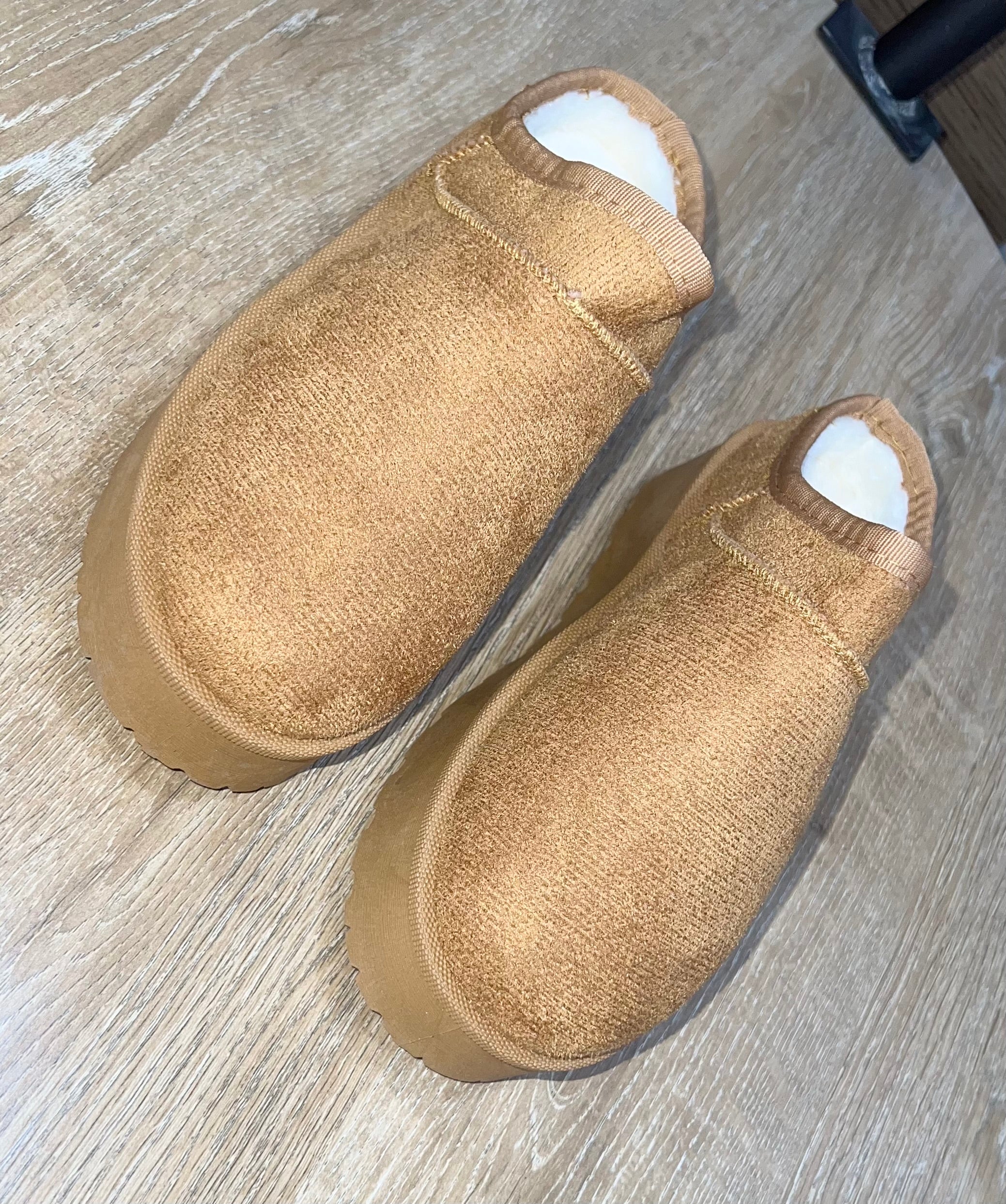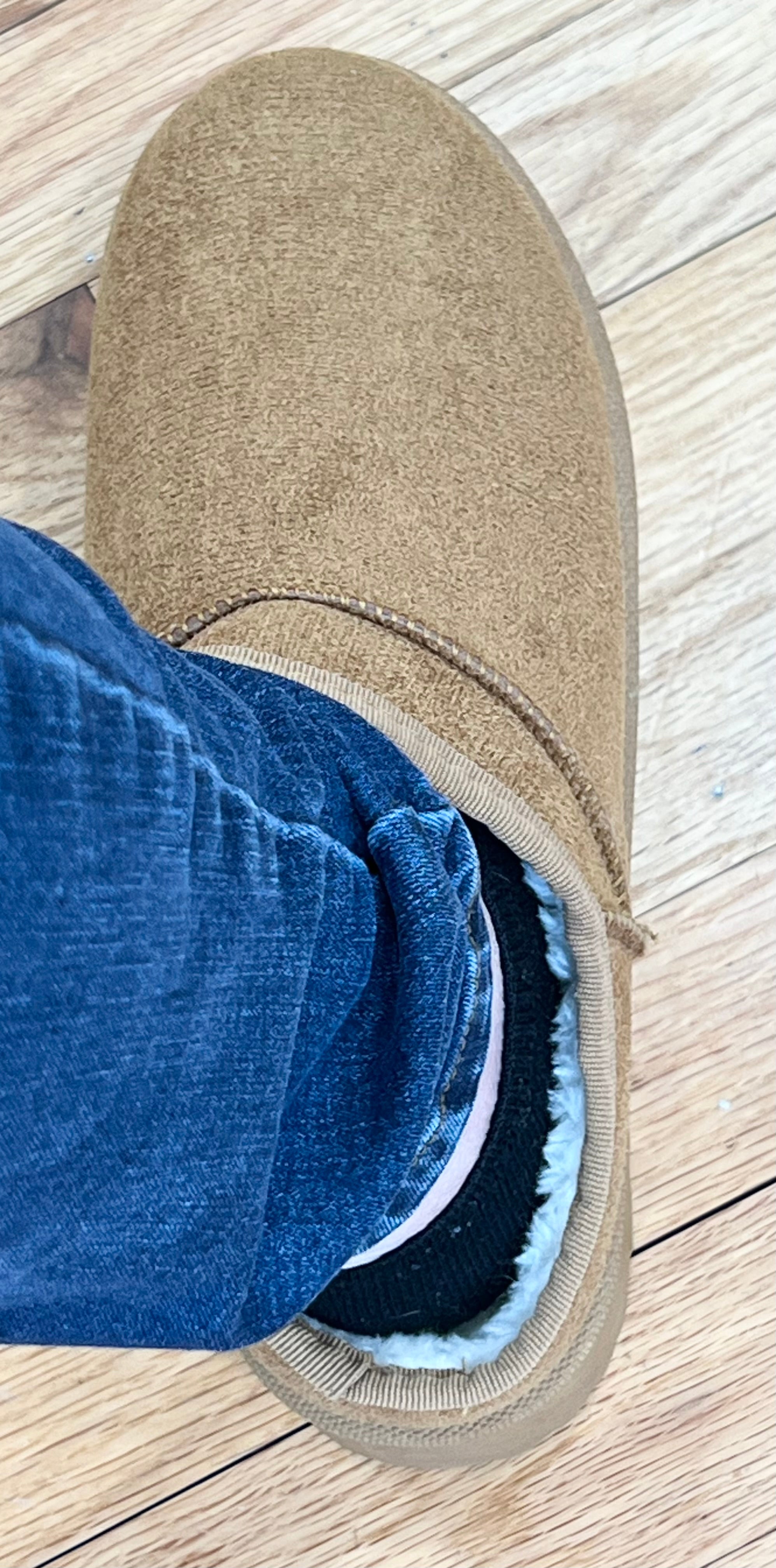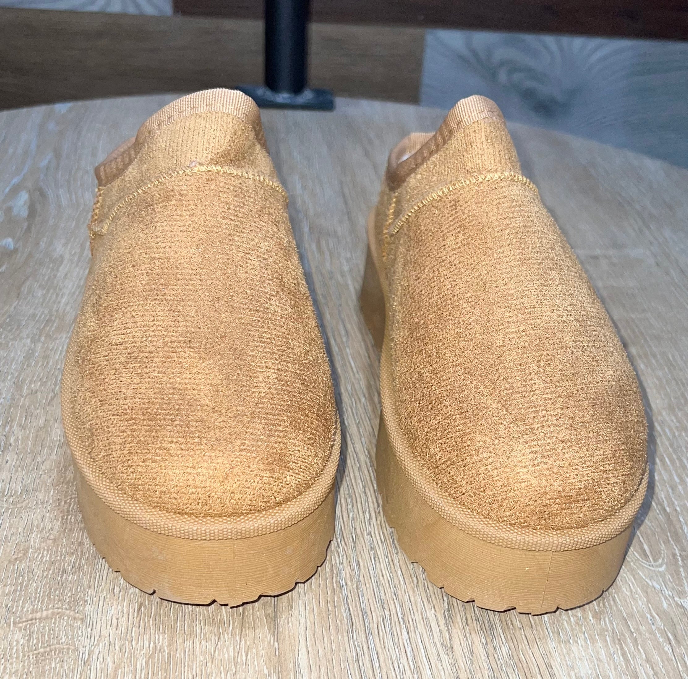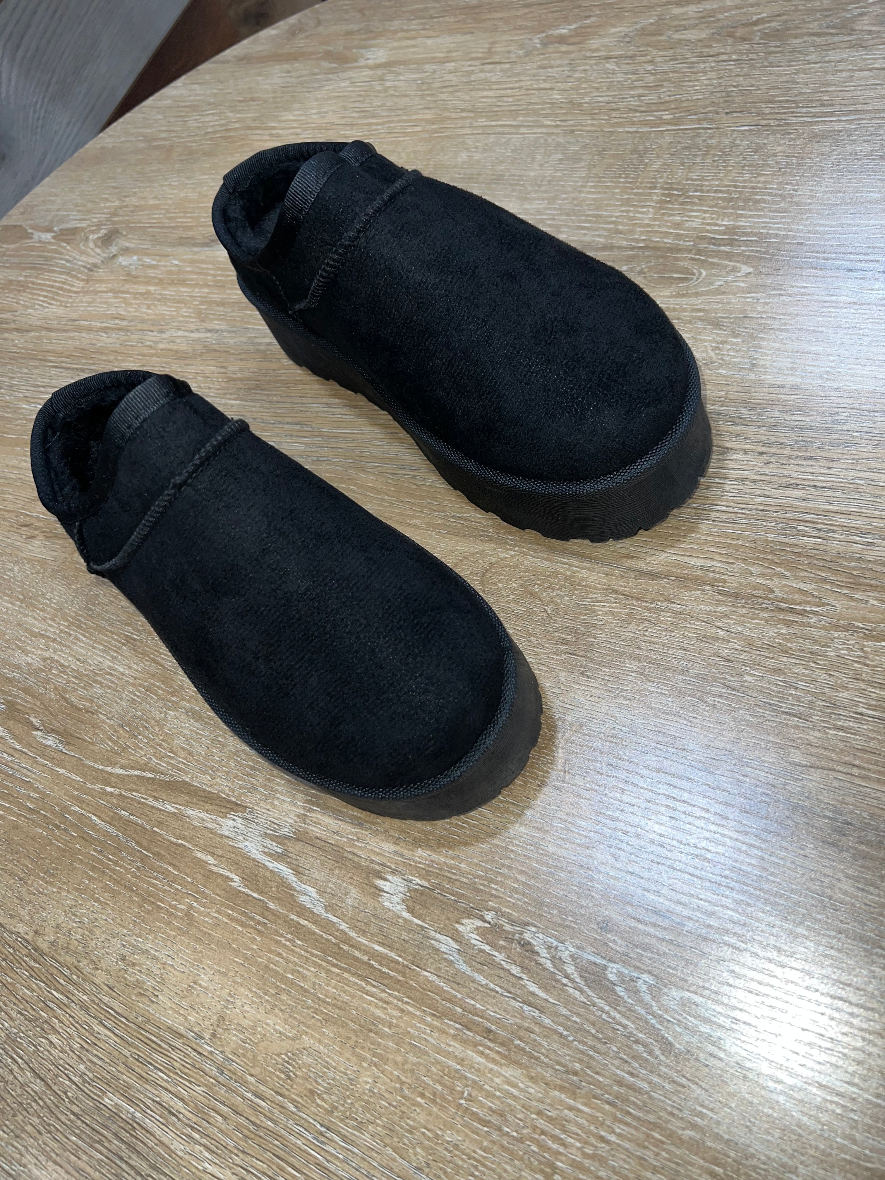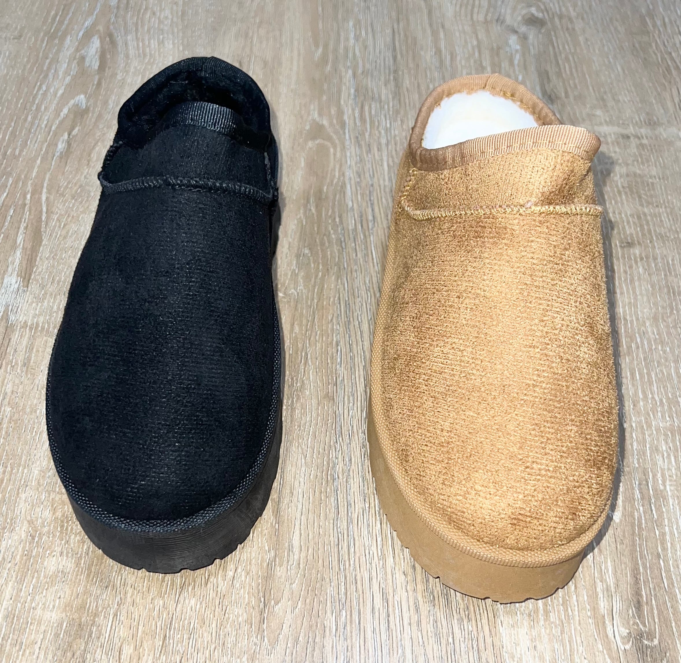 Slip right in to these faux fur lined platform ankle booties! Curved opening slip on style. Rubbery bottomed to prevent slip and slide and wet socks.