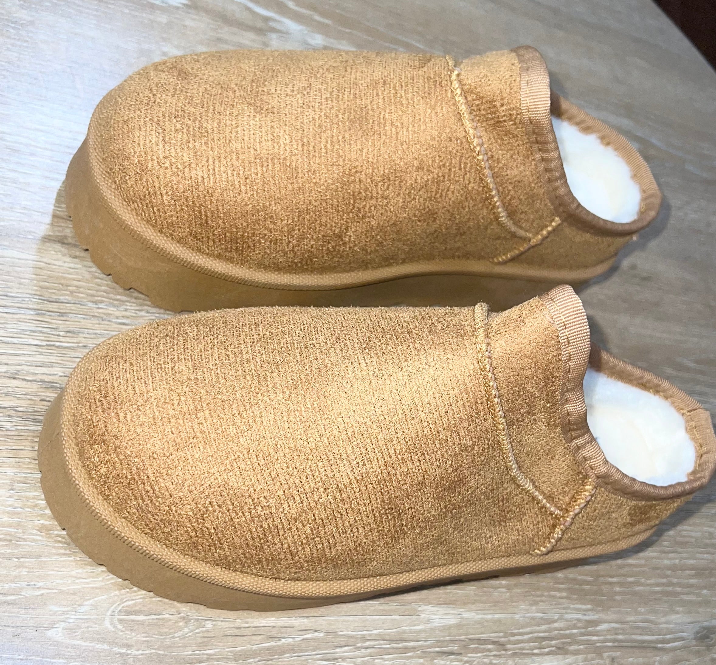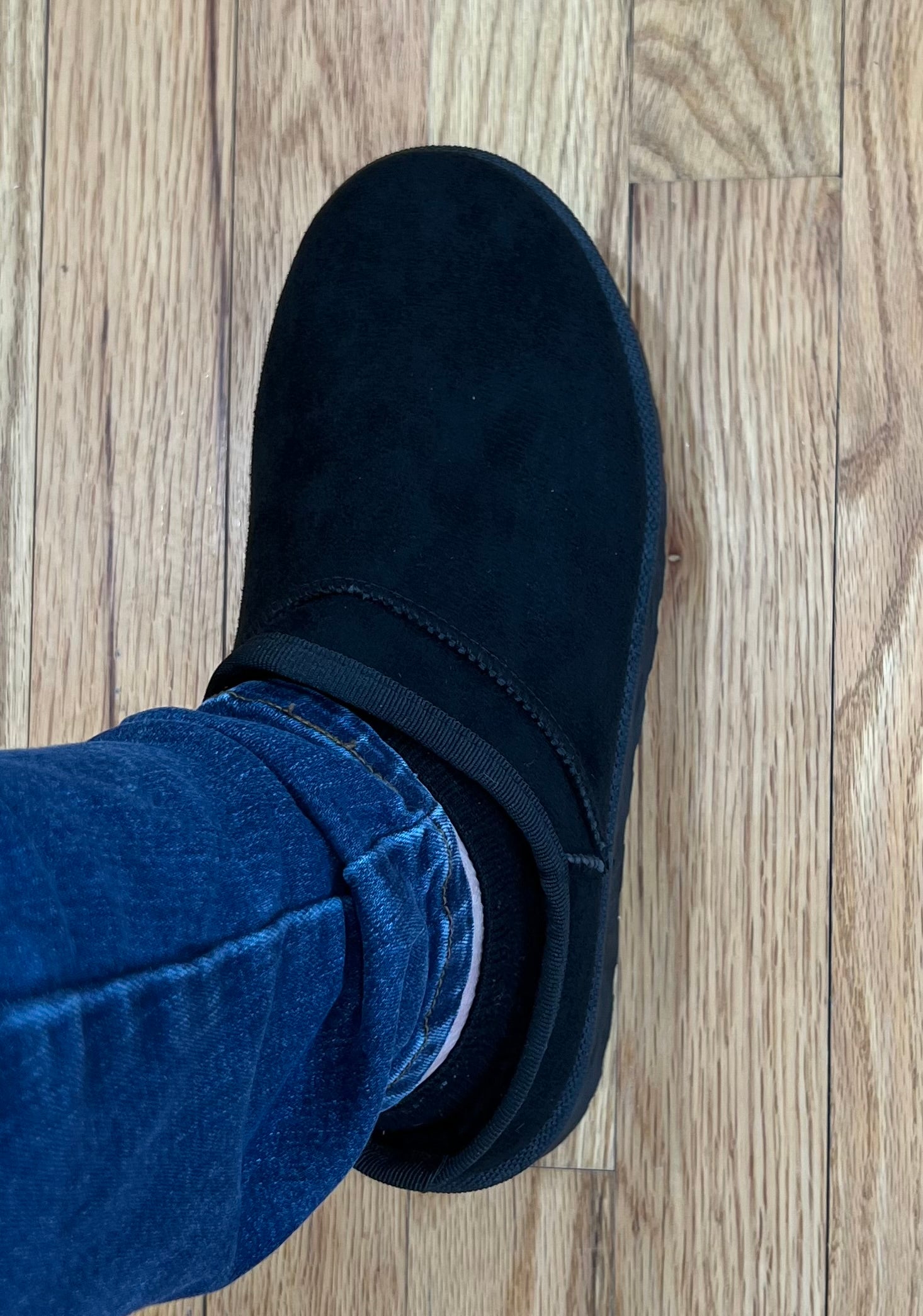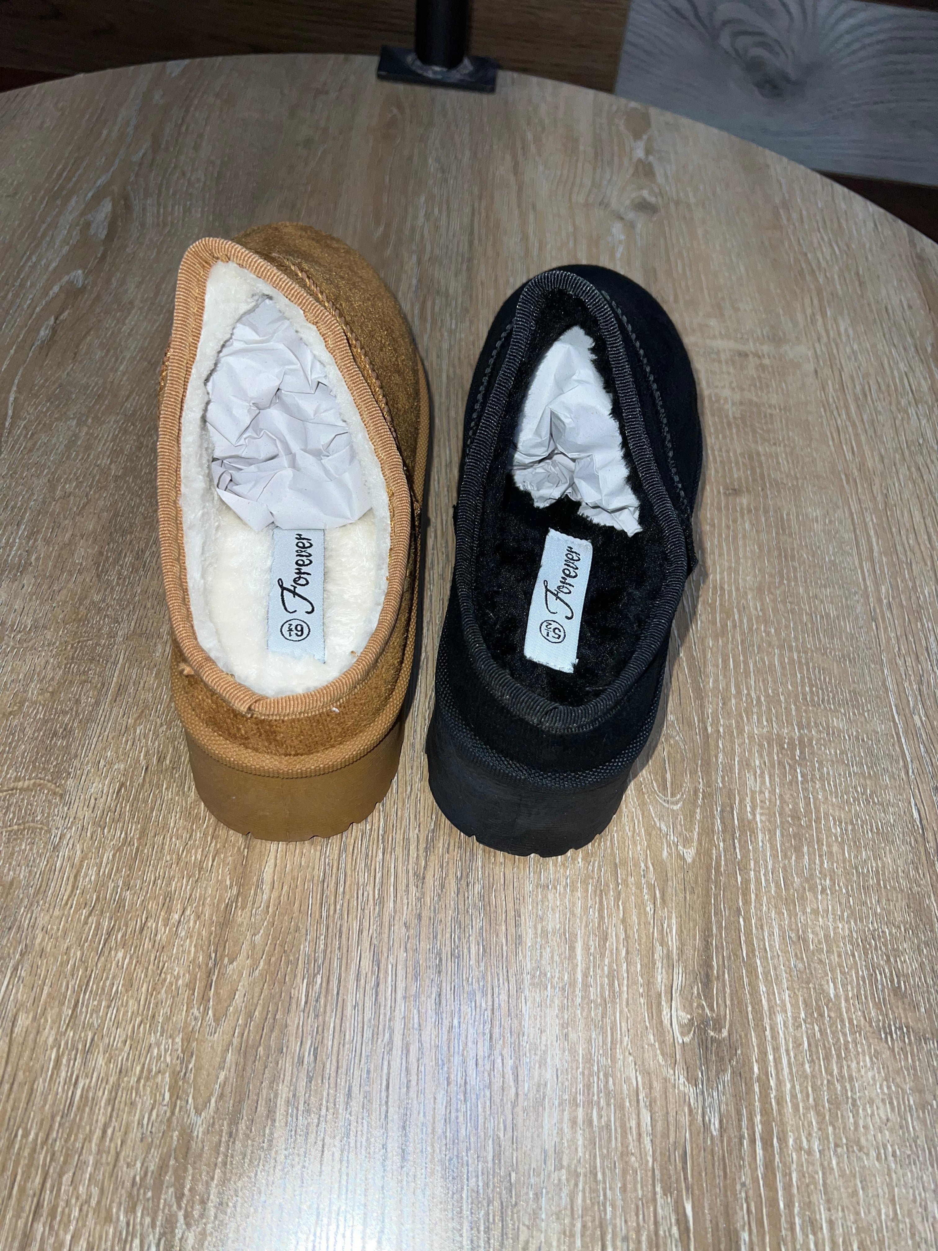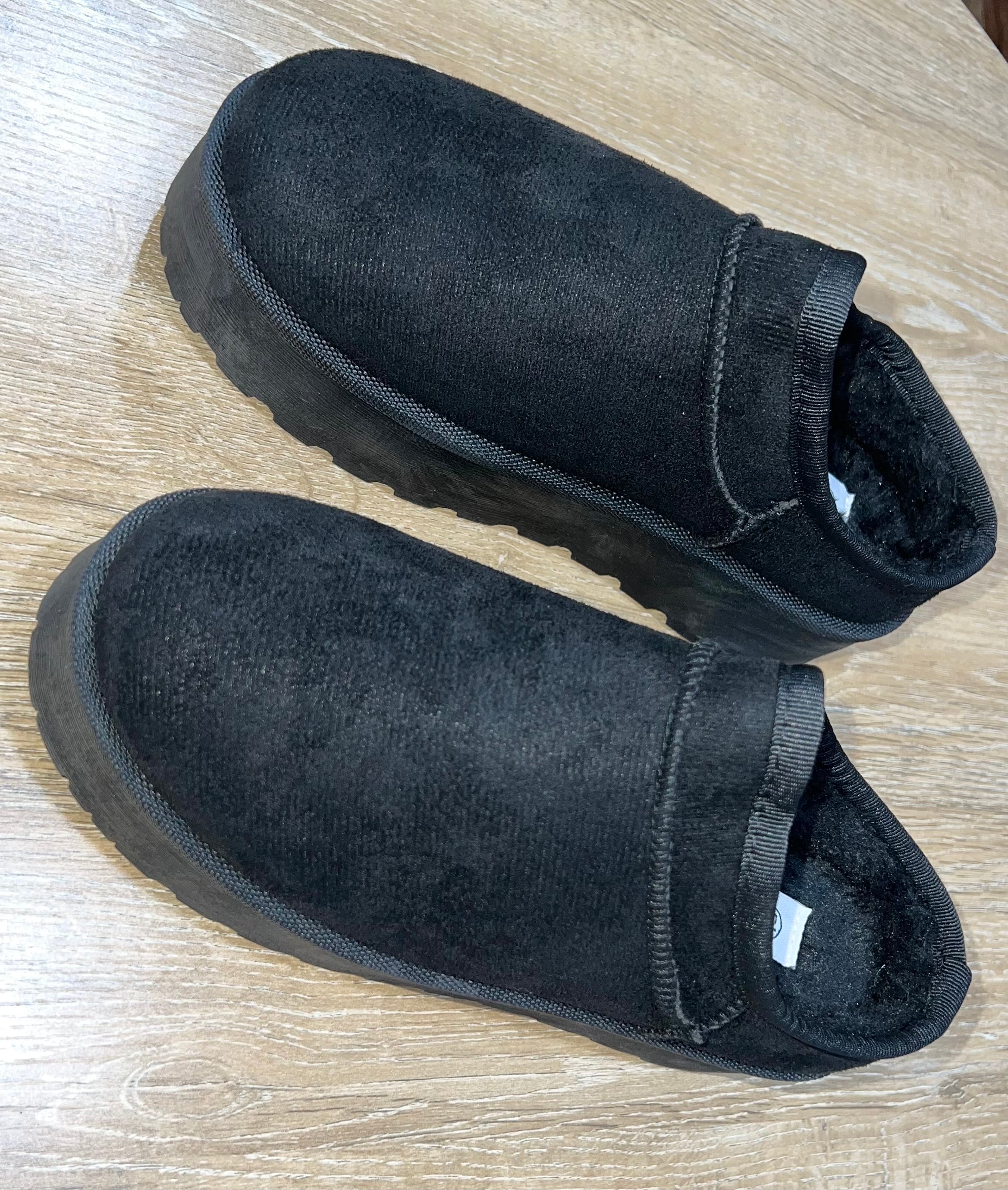 Slip right in to these faux fur lined platform ankle booties! Curved opening slip on style. Rubbery bottomed to prevent slip and slide and wet socks.