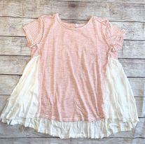 Light Pink and white stripes on the front and a white flowy bottom back.  Size Small